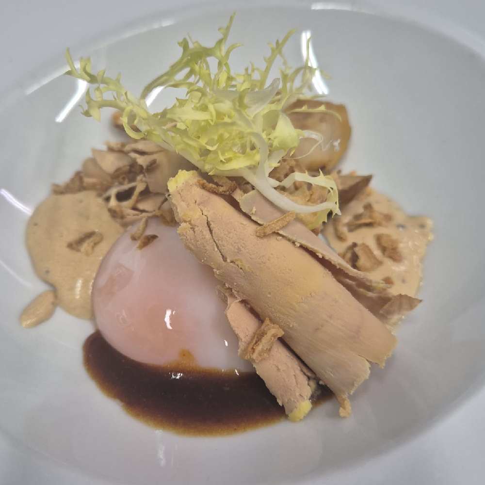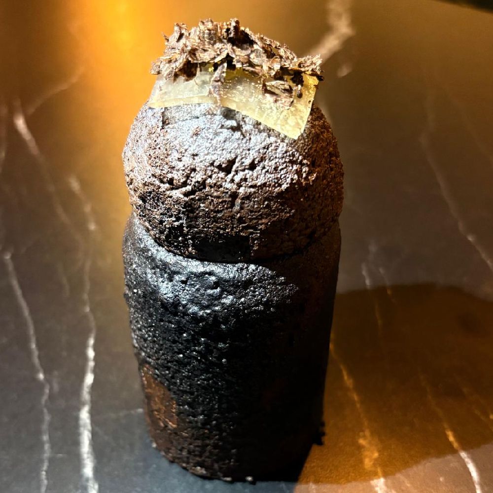 Bienvenidos al japón de los 30, katsu sando: sándwich brioche estilo japonés de costillas de cerdo en barbacoa trufada, coles, yema de huevo trufada, reducción de salsa Bull Dog sobre parmentier de borraja trufada y estrés de trufa negra de Aragón.