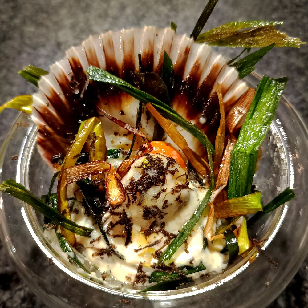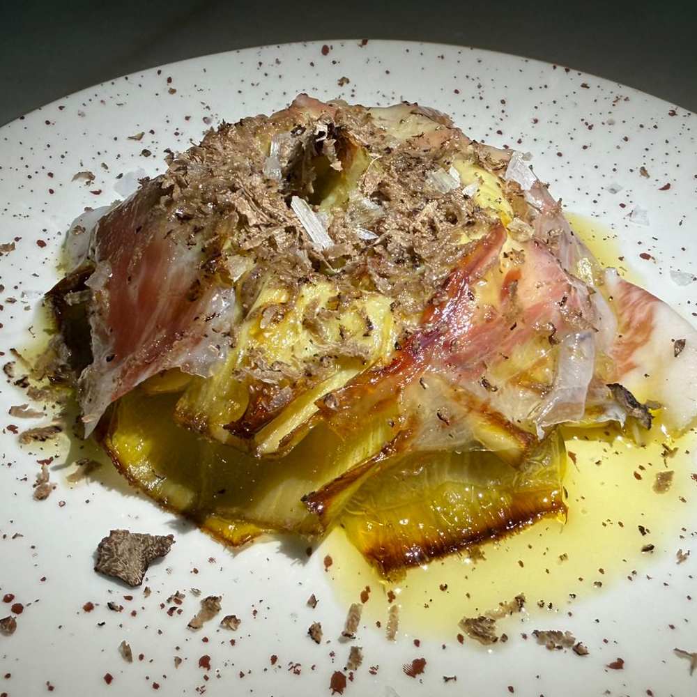 Hojaldre tatín de temporada: hojaldre de puerros, Jamón de Teruel DOP, cebolla y crema de burrata trufada y terminada con ralladura de trufa negra de Aragón.