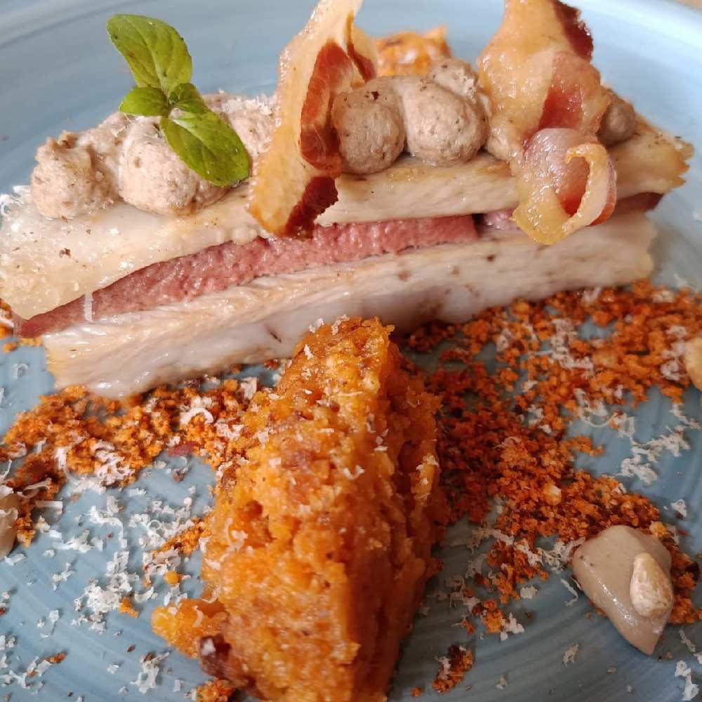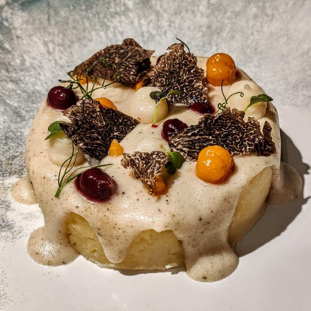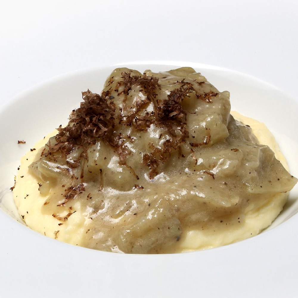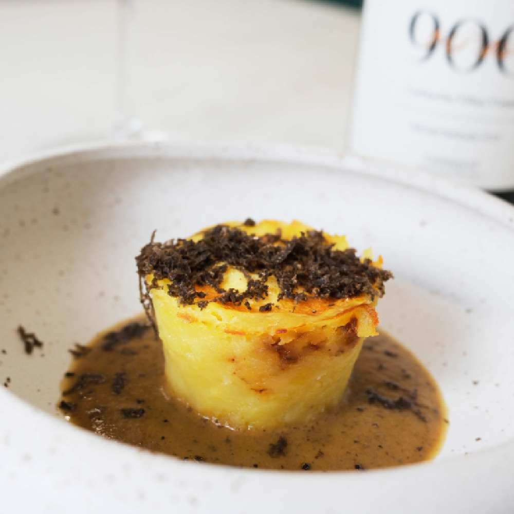 Panceta de Teruel a baja temperatura con reducción de vinos de Calatayud sobre parmentier de chirivía, trufa negra de Aragón y queso Nube de Albarracín.