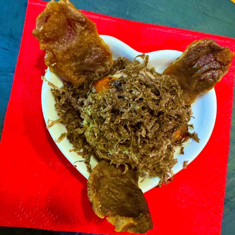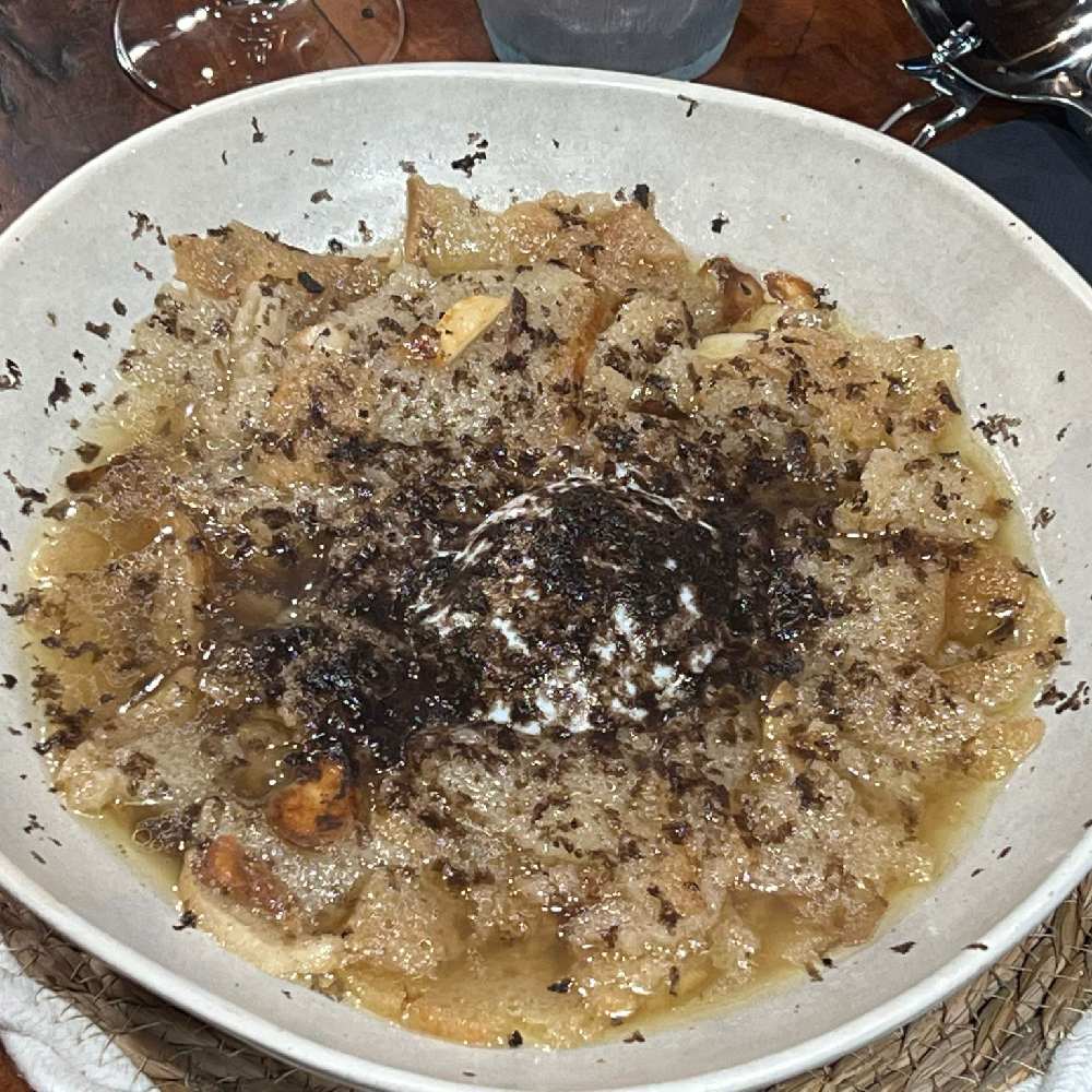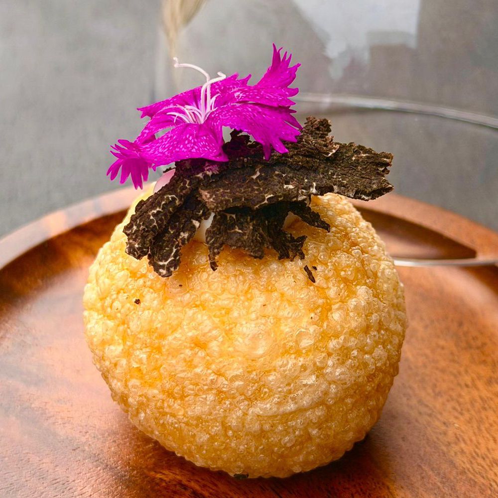 Puri Tuber: Pani puri clásico relleno de crema de trufa negra de Aragón con un velo de miel a la trufa y coronado con un demiglas de setas acompañado de un caldo de gallina trufada.