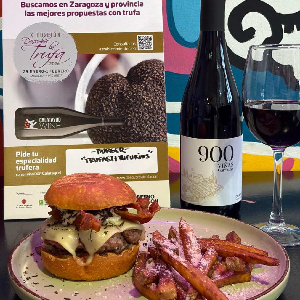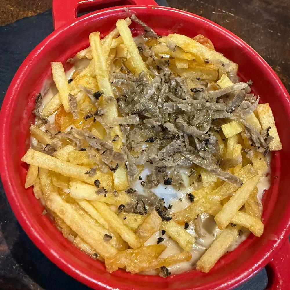 Hamburguesa trufada: ternera, cebolla crujiente, champiñón portobello, bacon, cheddar, salsa birrosta trufada, pan brioche, patatas fritas terminadas con parmesano y rallado de trufa negra.